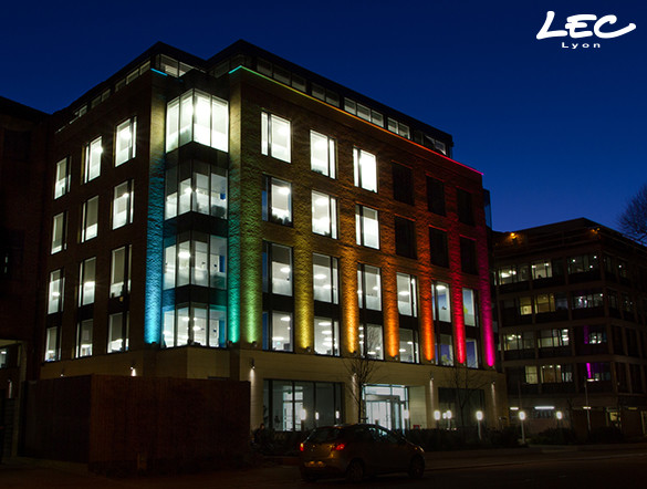 11 adjustable 4060-Luminy 6 projectors, with a 10° optic illuminate the 15-meter high facade of 22 Station Road with interactive columns of animated light.