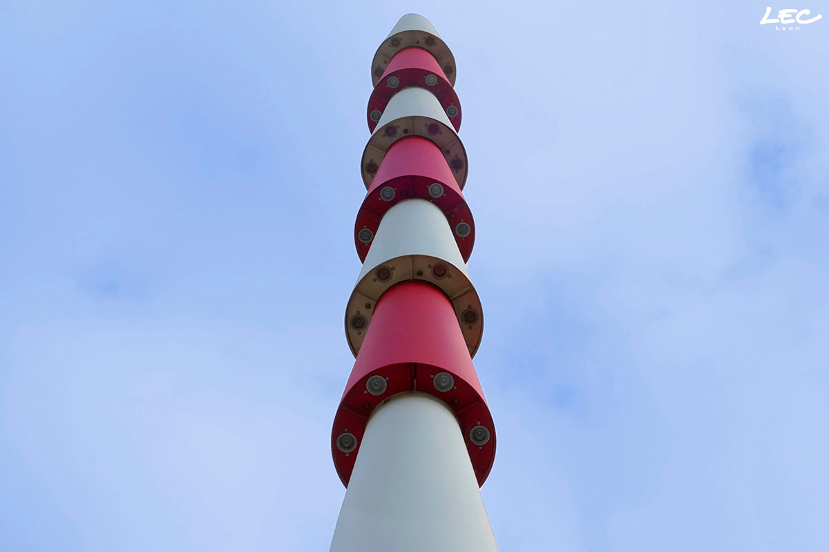 Des luminaires spéciaux, sur la base des projecteurs BORDEAUX (1530), installés en partie inférieure des cônes et éclairant vers le bas, créent un dégradé de lumière en luminance le long du cône et assurent l'éclairage au sol des abords.
