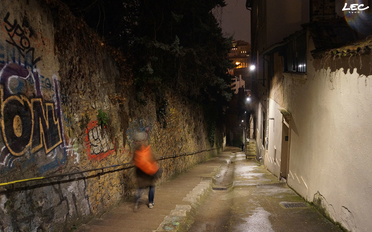 The street, approximately 500 meters long, allows pedestrians to go from the Croix Rousse quarter down to the docks by the river Rhône, whilst enjoying a panoramic view on the Park Tête d'Or.